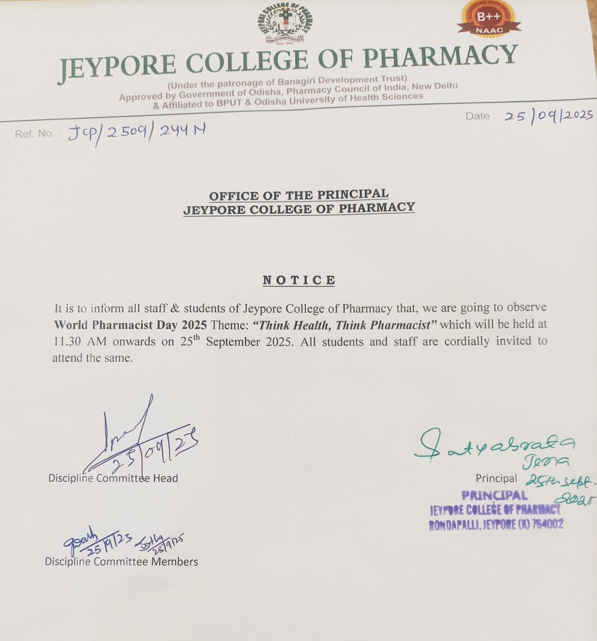 Jeypore College of Pharmacy, Rondapalli, Jeypore, is committed to provide quality based education to the students, which will help them to challenge all types of requirement of Industry, Research and Health need of Society. Jeypore College of Pharmacy promised to make well trained, skilled Pharmacist, those will be sufficient enough to face all types of challenges in Pharmaceutical field in Health Care System by exhibiting good performance in Industry, Research and Medical field.